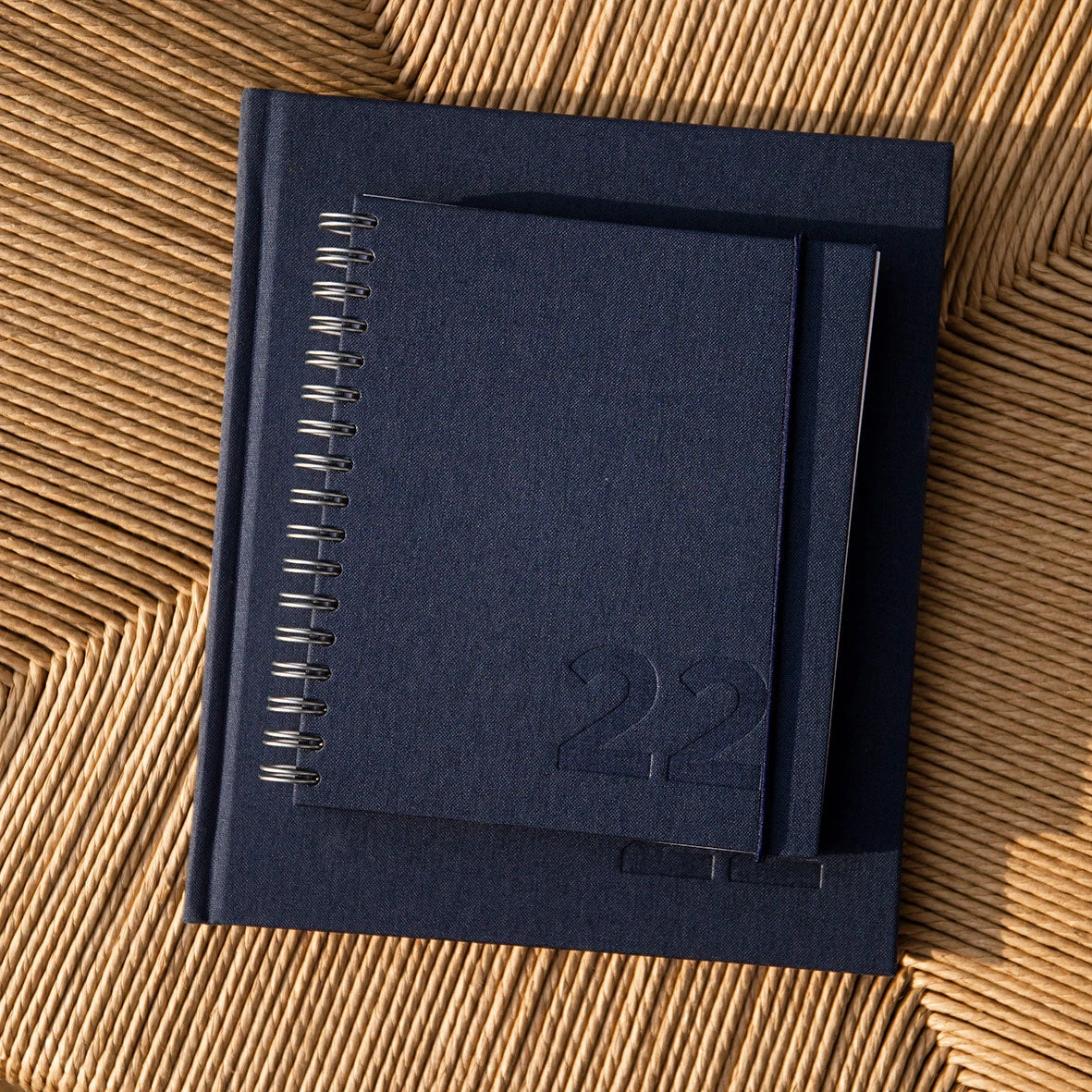 Get organised for 2022 with the smoke blue, cloth-bound Bookbinders Design diary. The regular sized, hard cover diary features a week per double page, as well as a monthly overview. The number 22 is blind debossed on the bottom right hand corner, while a black ribbon makes it easy to bookmark pages.Â