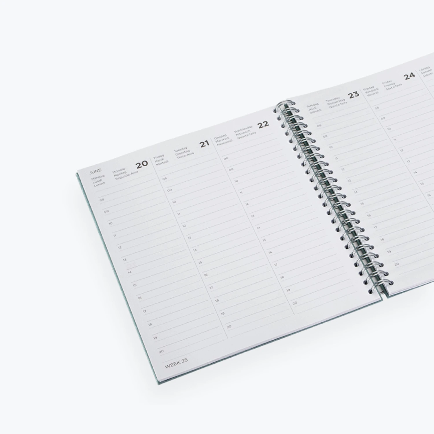Get organised for 2022 with the smoke blue, wire-o Bookbinders Design diary. The regular sized, hard cover features a week per double page, as well as a monthly overview. The number 22 is blind debossed on the bottom right hand corner, while the elastic closure keeps the diary shut and a black ribbon makes it easy to bookmark pages.
