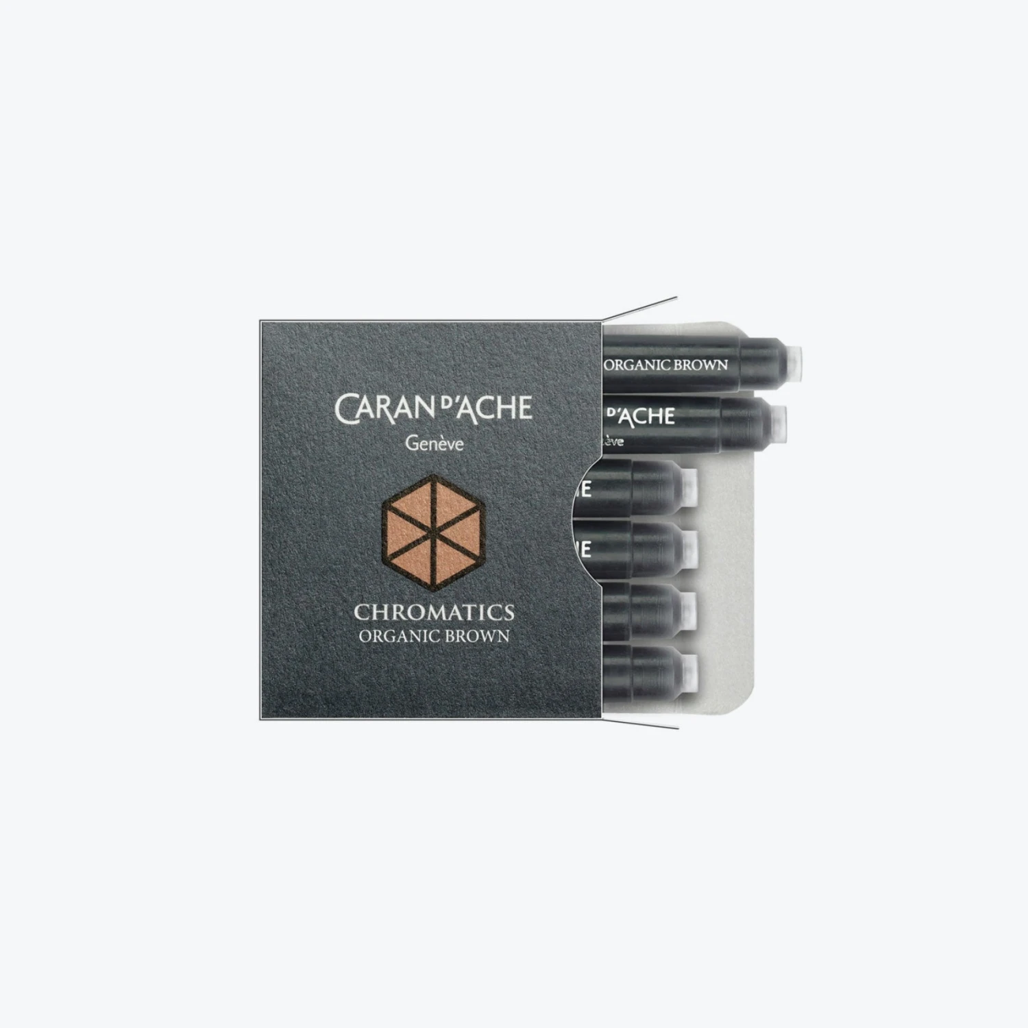 This pack contains 6 international ink cartridges filled with organic brown ink. Can be used as a refill for the Caran d’Ache 849 fountain pens or any other brands that take international cartridges.