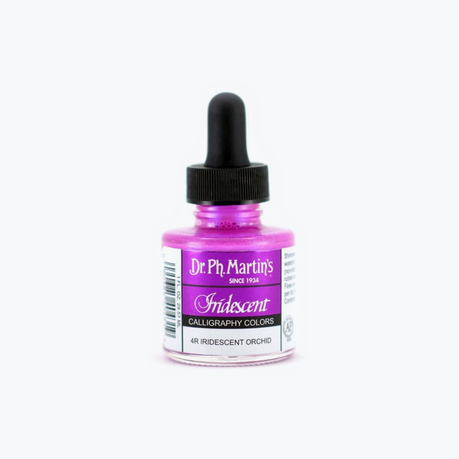 Dr. Ph. Martin’s Iridescent Calligraphy Colours are shimmering, highly reflective colours that are lightfast, waterproof, archival, and permanent. Made from the finest ground pigments, the unmatched colour intensity of Dr. Ph. Martin’s Iridescent Calligraphy Colours gives you the ability to cover dark surfaces with a dynamic range of metallic colour. Great for use on paper, wood, board, metal, and some plastics. Dr. Ph. Martin’s Iridescent Calligraphy Colours dries smooth and even every time. No start and stop marks. Great for use with pens (both calligraphy and dip pens), airbrushes, and brushes. Designed specially for calligraphy, to accent watercolour work, or anywhere where you need to add a magical shine and shimmer that only pigment-based iridescent colour can provide.