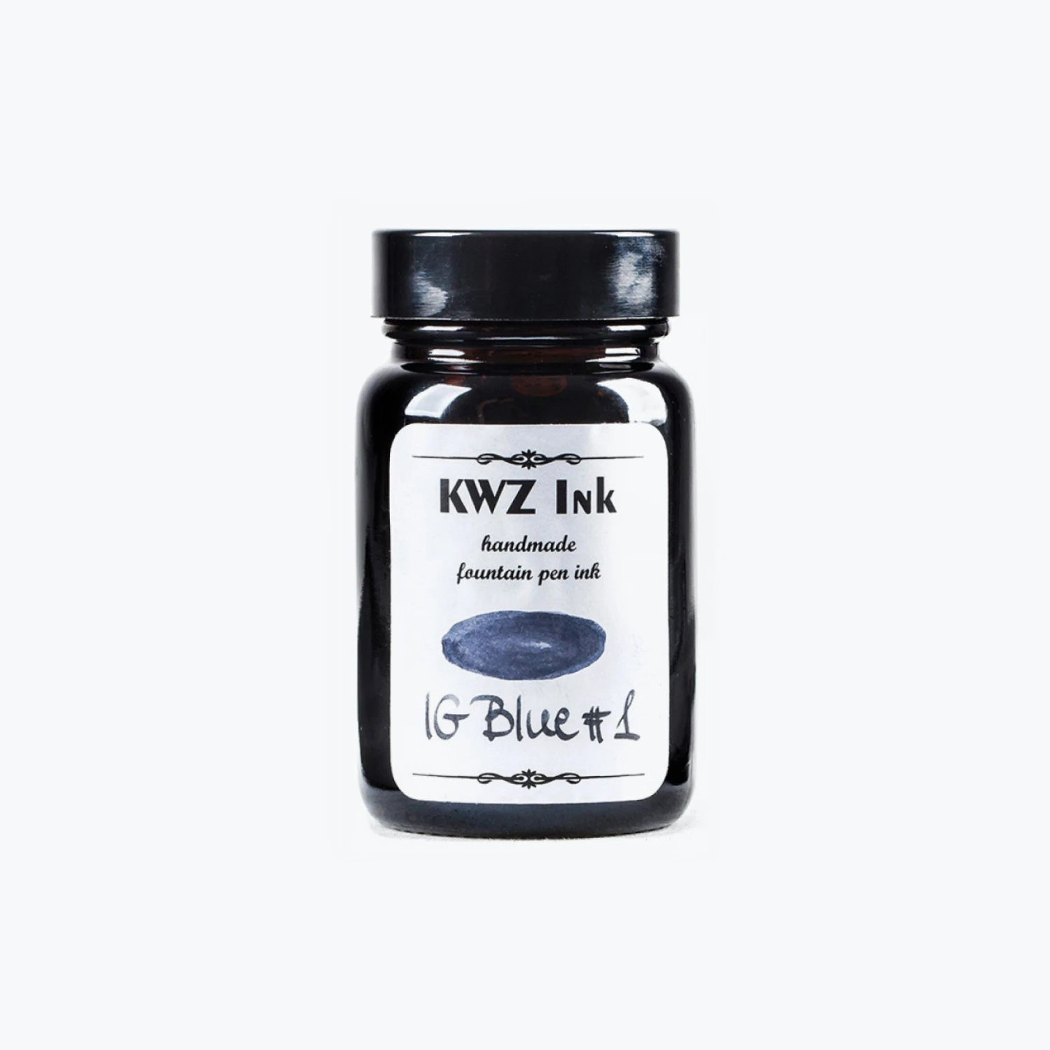 The IG Blue #1 handmade bottle contains 60mL, while the hand-written label is another defining feature of KWZ. They are a remarkable find for those who appreciate colour intensity, durability and wet flowing fountain pen inks for a great writing experience.Â