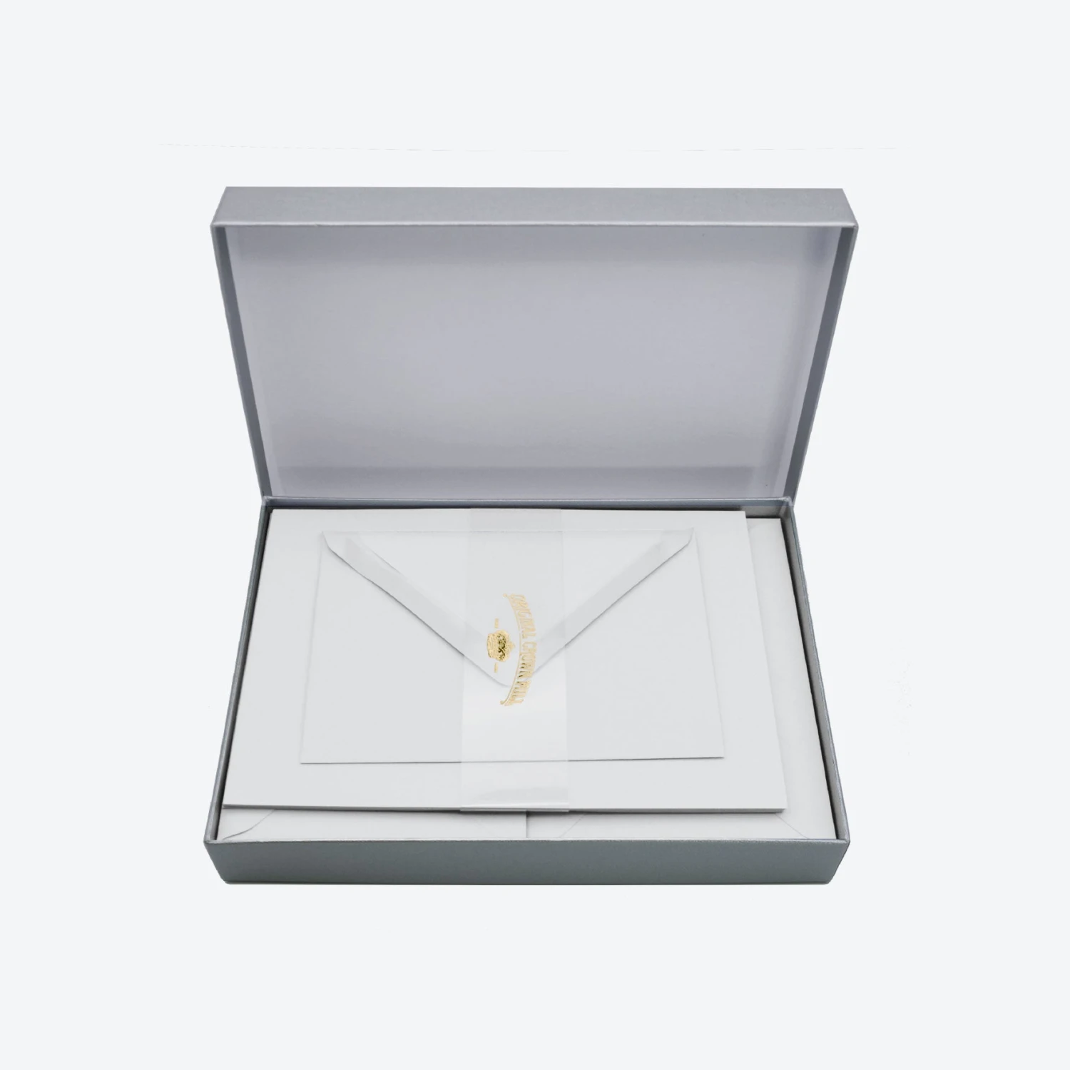 Made in Belgium. this Crown Mill letter set includes 25 flat sheets of white, laid paper with a white border and 25 matching C6 envelopes that are tissue lined. The set comes in a sturdy, silver presentation box.Â