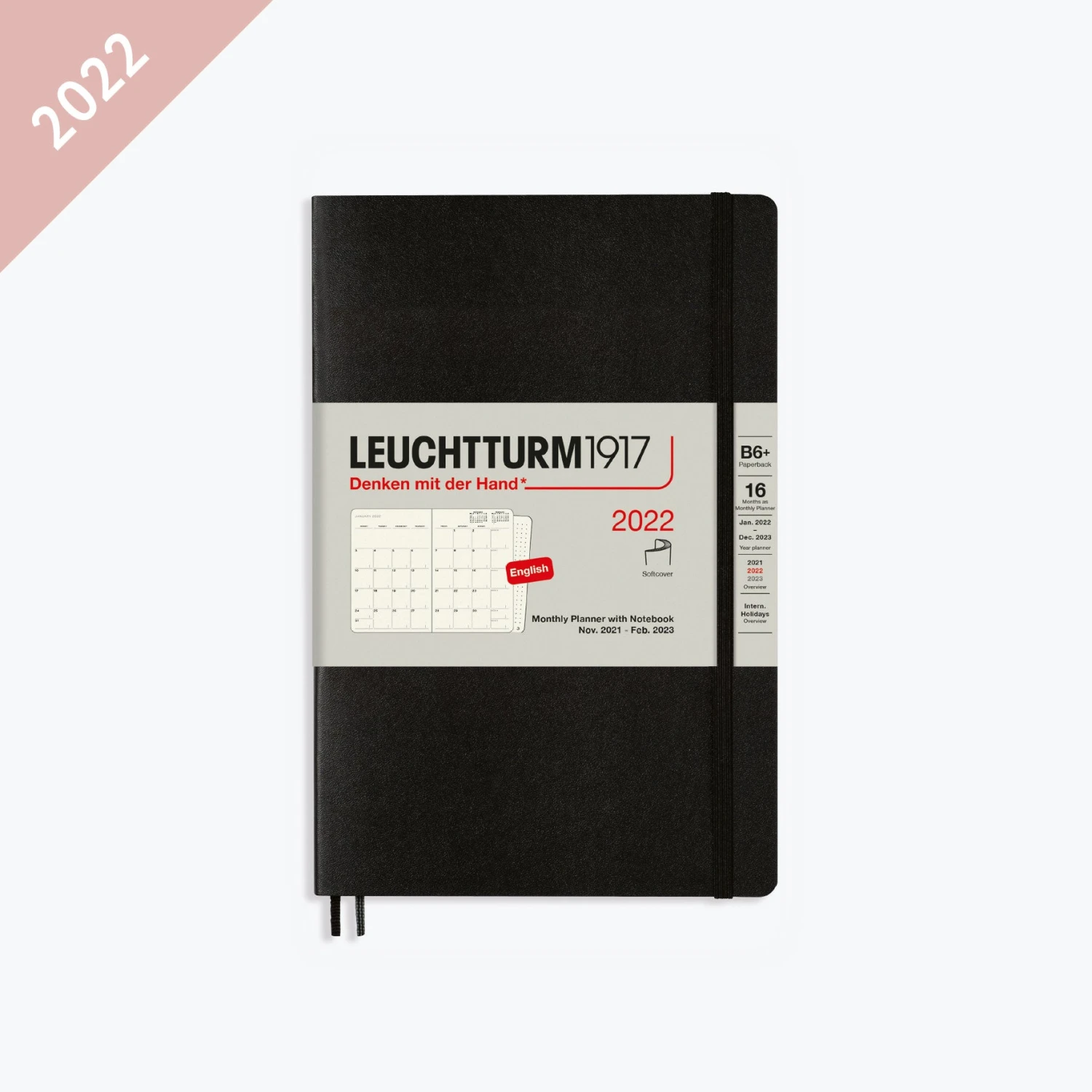 The B6 black Leuchtturm1917 monthly notebook diary is a simple yet functional companion for 2022. It features a double page spread for each month, with weeks listed horizontally underneath one another. The planner starts in November 2021 and lasts for 16 months (February 2023). 138 notebook pages can be found behind the diary and boxes for cross referencing and page numbers link the monthly planner with the notebook.Â