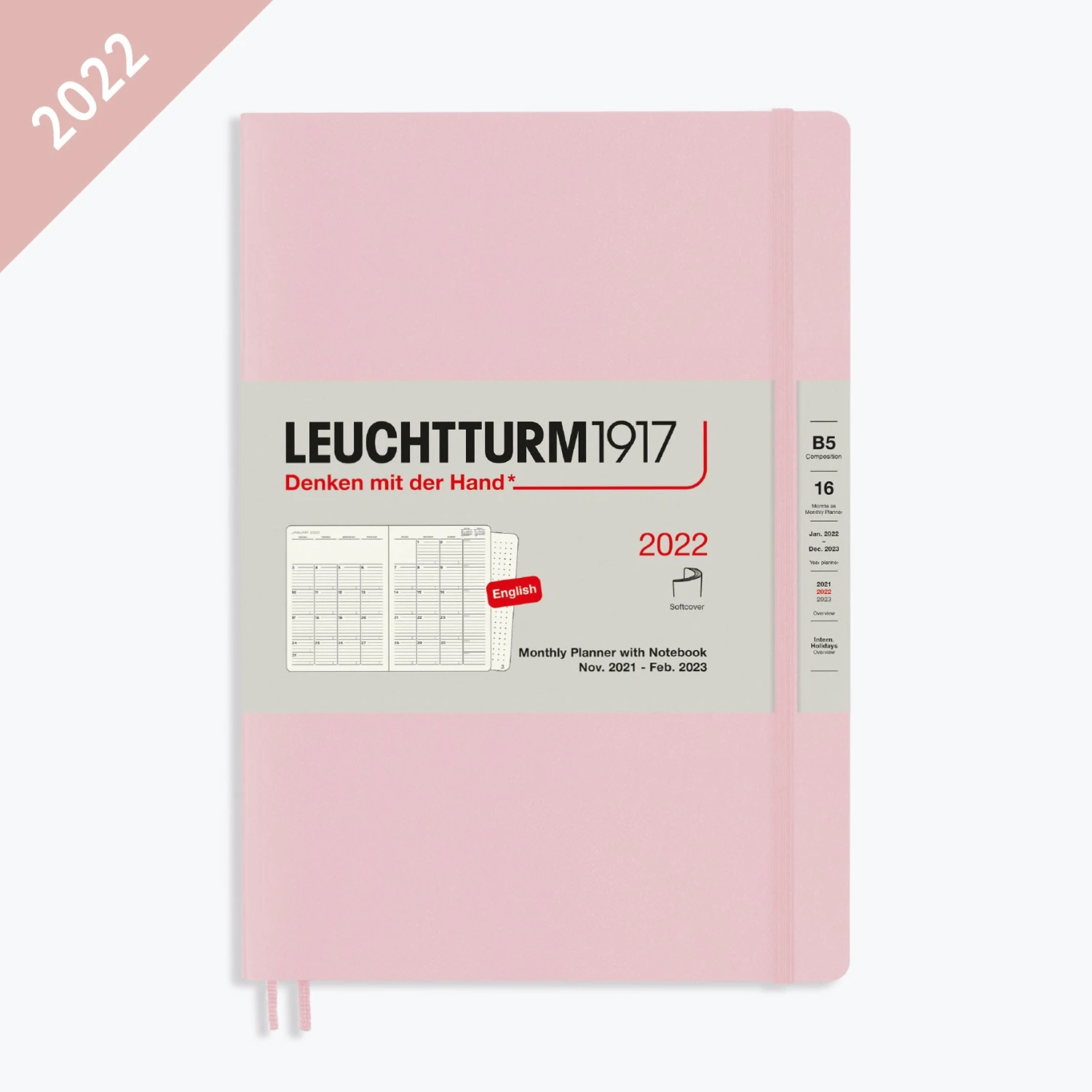 The B5 powder pink Leuchtturm1917 monthly notebook diary is a simple yet functional companion for 2022. It features a double page spread for each month, with weeks listed horizontally underneath one another. The planner starts in November 2021 and lasts for 16 months (February 2023). 138 notebook pages can be found behind the diary and boxes for cross referencing and page numbers link the monthly planner with the notebook.Â