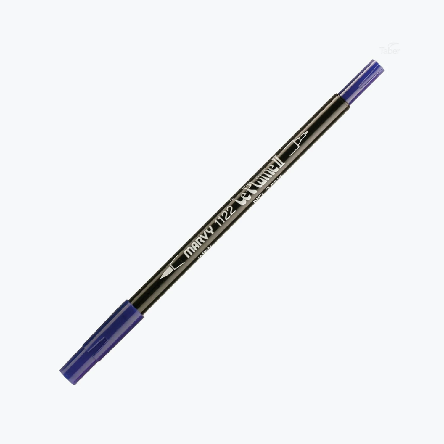 The Blue #3 Marvy Uchida Le Plume II is a dual end, water-based marker with a smooth brush on one end and an extra fine tip on the other. The ink is acid-free and non-toxic. The ink is also water based and blendable, making it ideal for a variety of uses including writing, journalling, rubber stamping, card making and drawing.Â