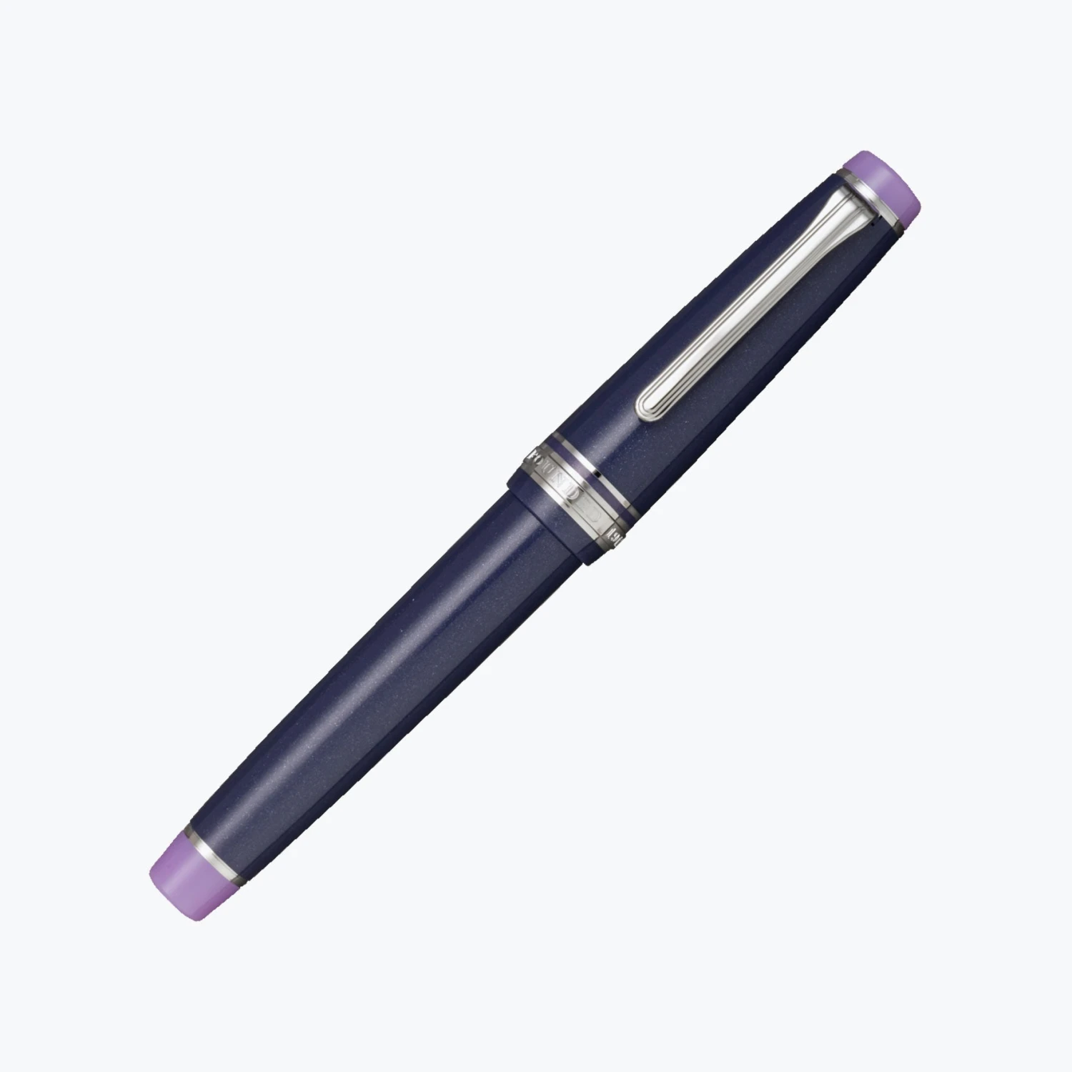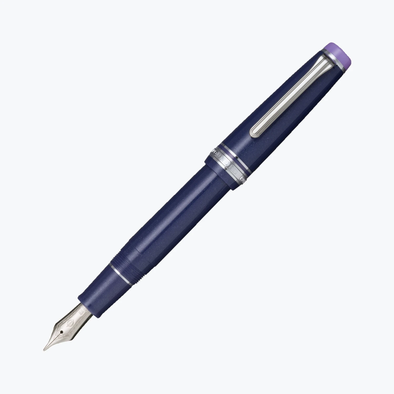 The Sailor Storm Over the Ocean is a limited edition ProGear fountain pen that features a metashine navy barrel and cap, complemented by silver-plated accents. The contrasting purple coloured end cap features the Sailor anchor logo.