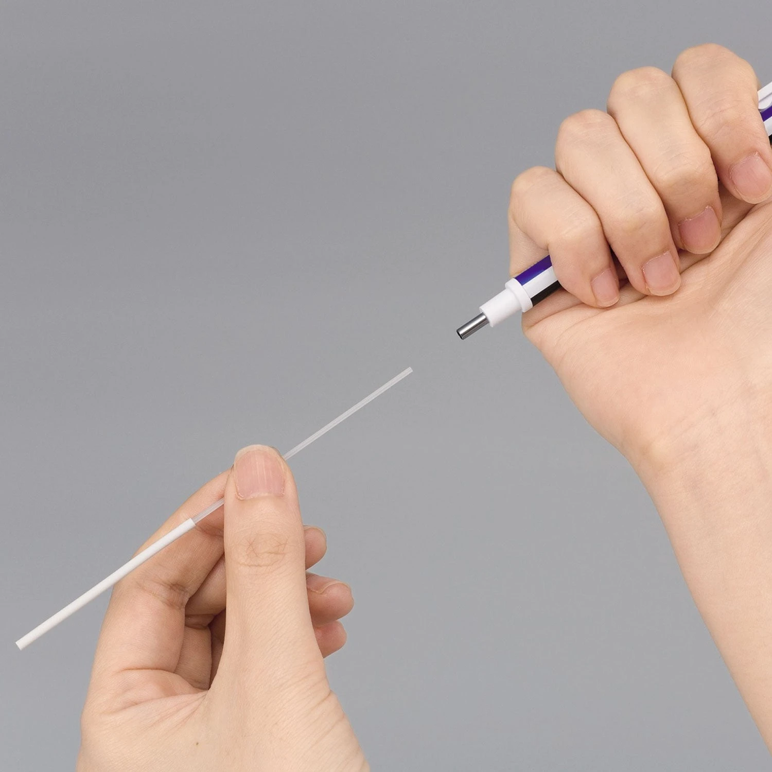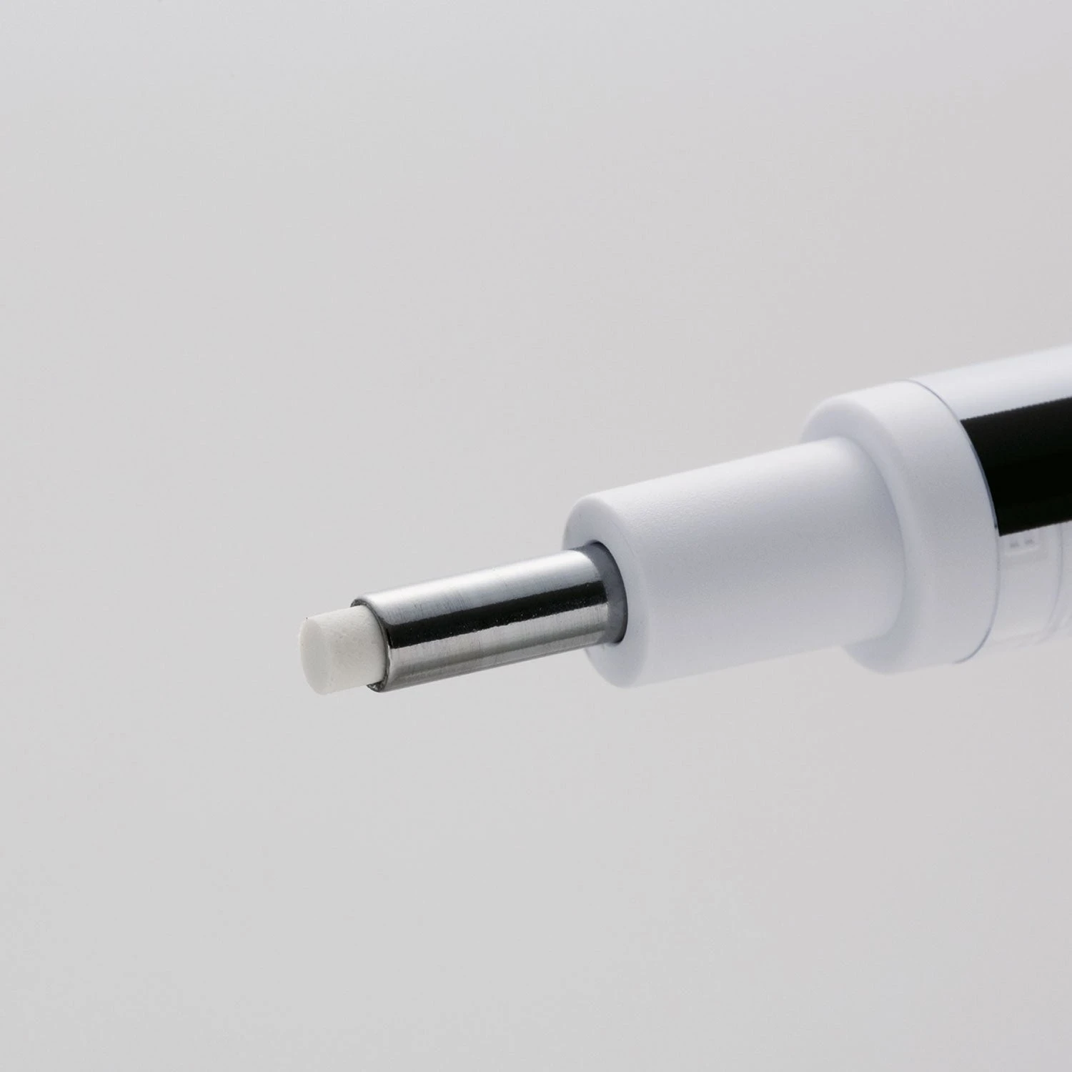 The unique indirect chucking system extends the eraser by only 0.7 mm with each push. To refill the eraser, push and hold the knock button on the main body and insert the eraser with the plastic stick from the tip of the sleeve.