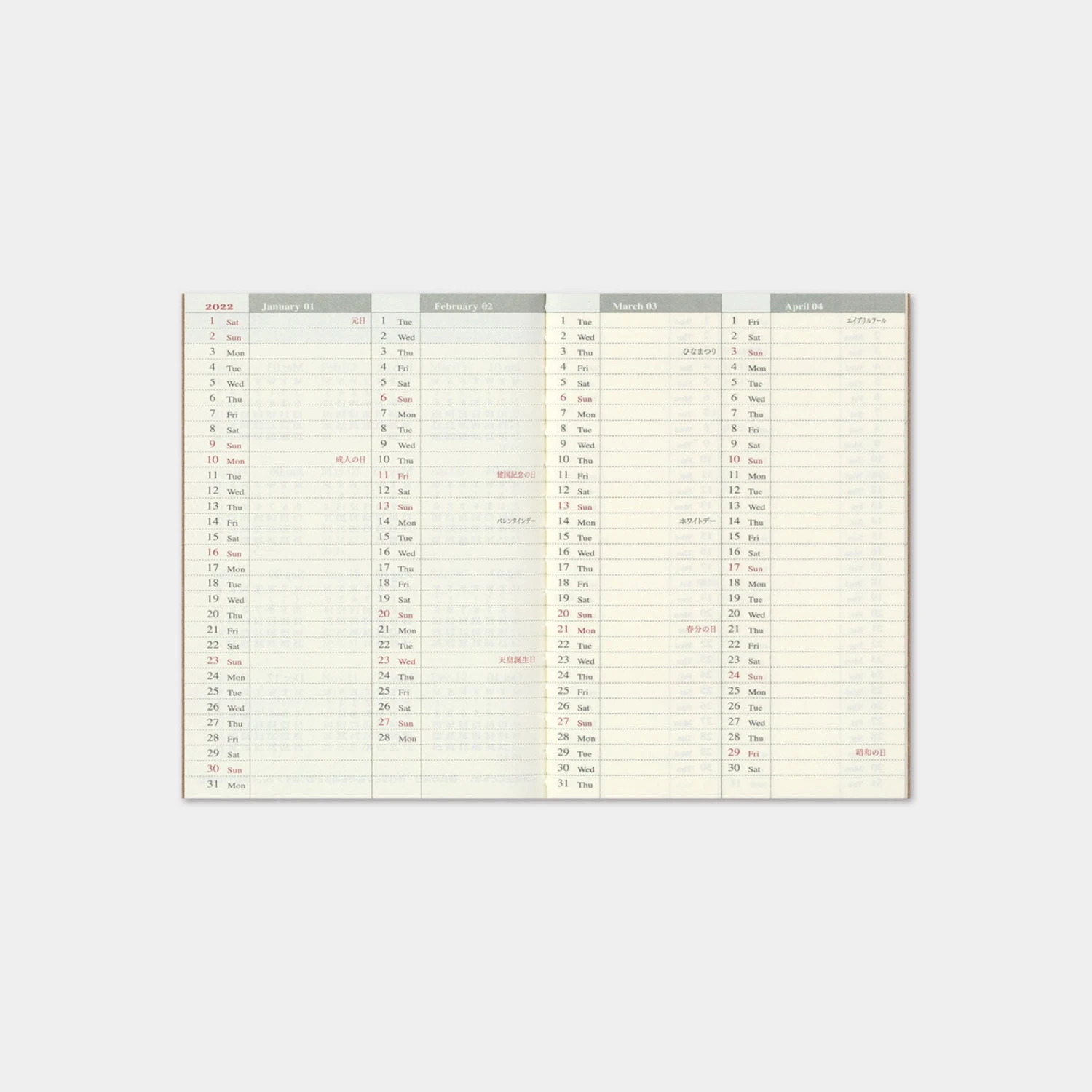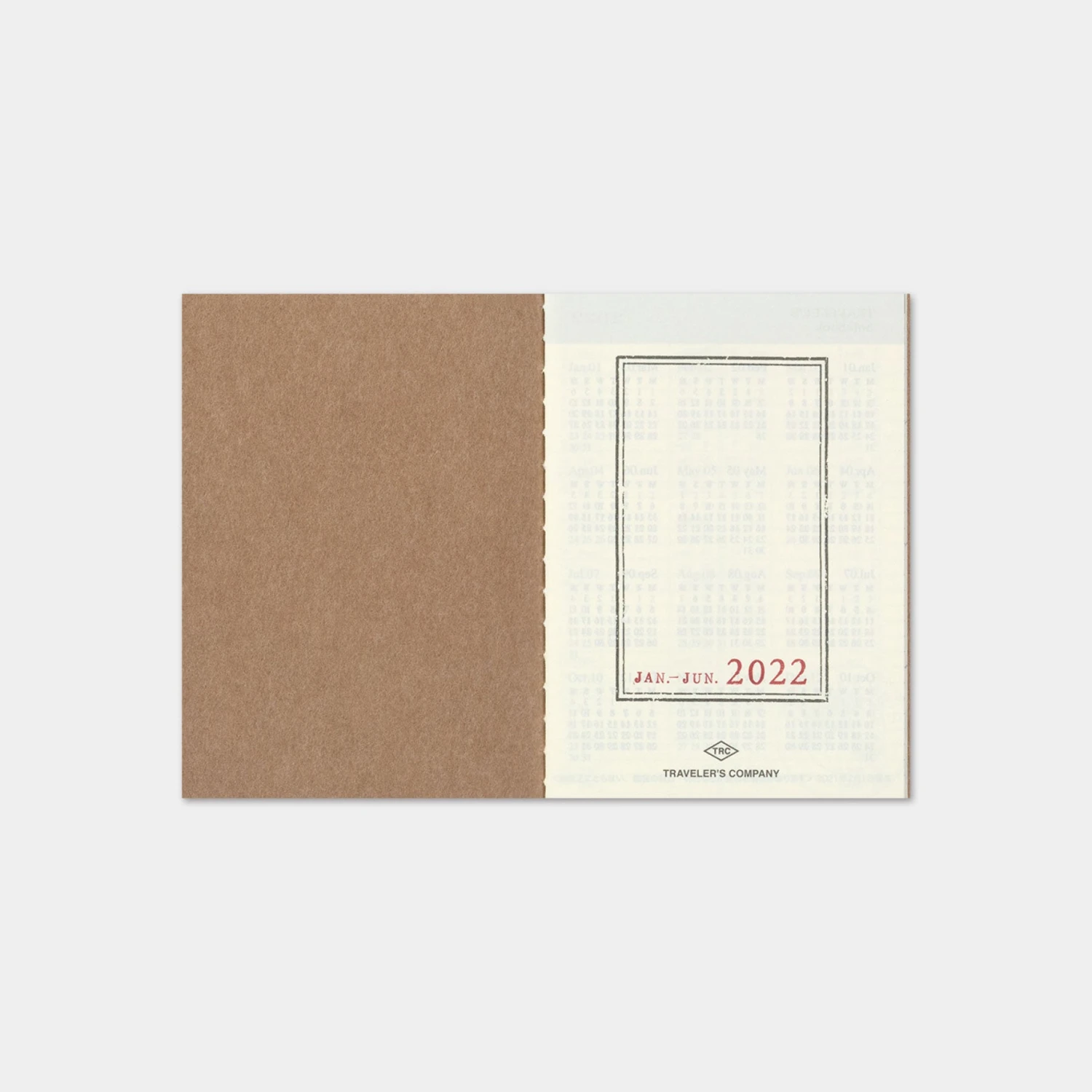 The Traveler’s Company 2022 diary (weekly) is a passport size insert for the Traveler’s Notebook that features two refills, with each covering a 6 month period (Jan-Jun 2022 and Jul-Dec 2022).Â